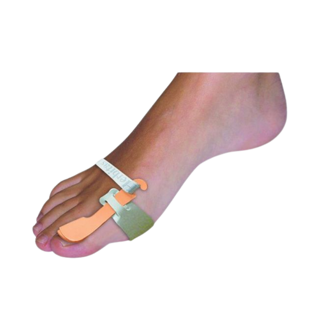 Corretor noturno desenvolvido para manter o pé na posição correta durante o descanso, reduzindo a dor e evitando a progressão do joanete.