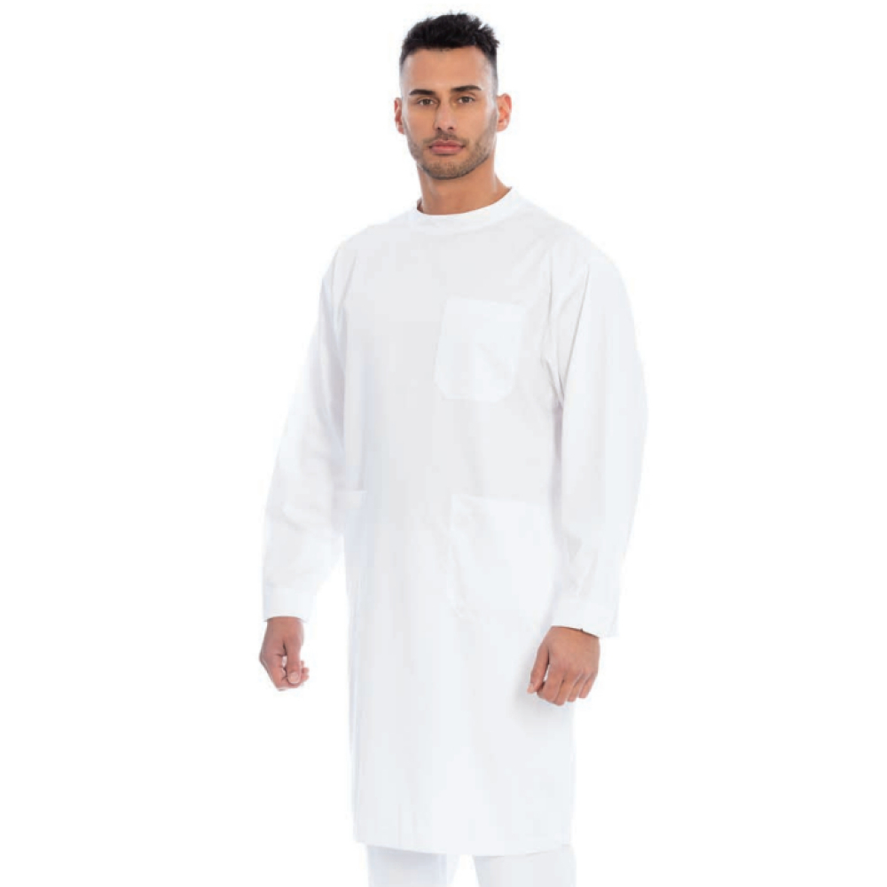 Bata masculina com botões atrás e composta por sarja, 65% poliester e 35% algodão.
