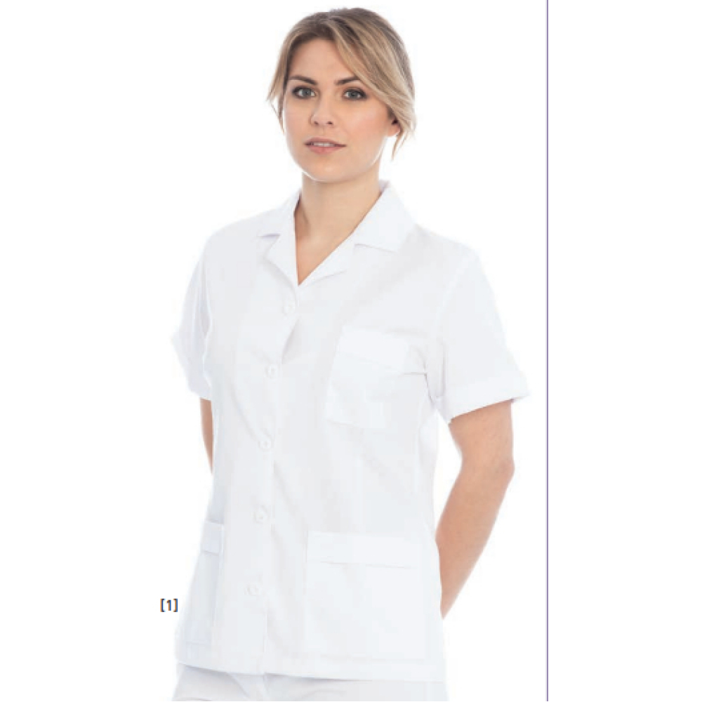 Túnica branca com botões composta por sarja, 65% poliester e 35% algodão.