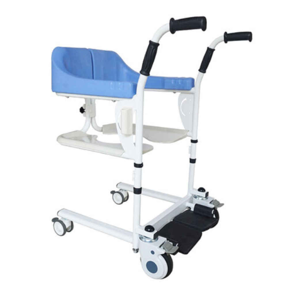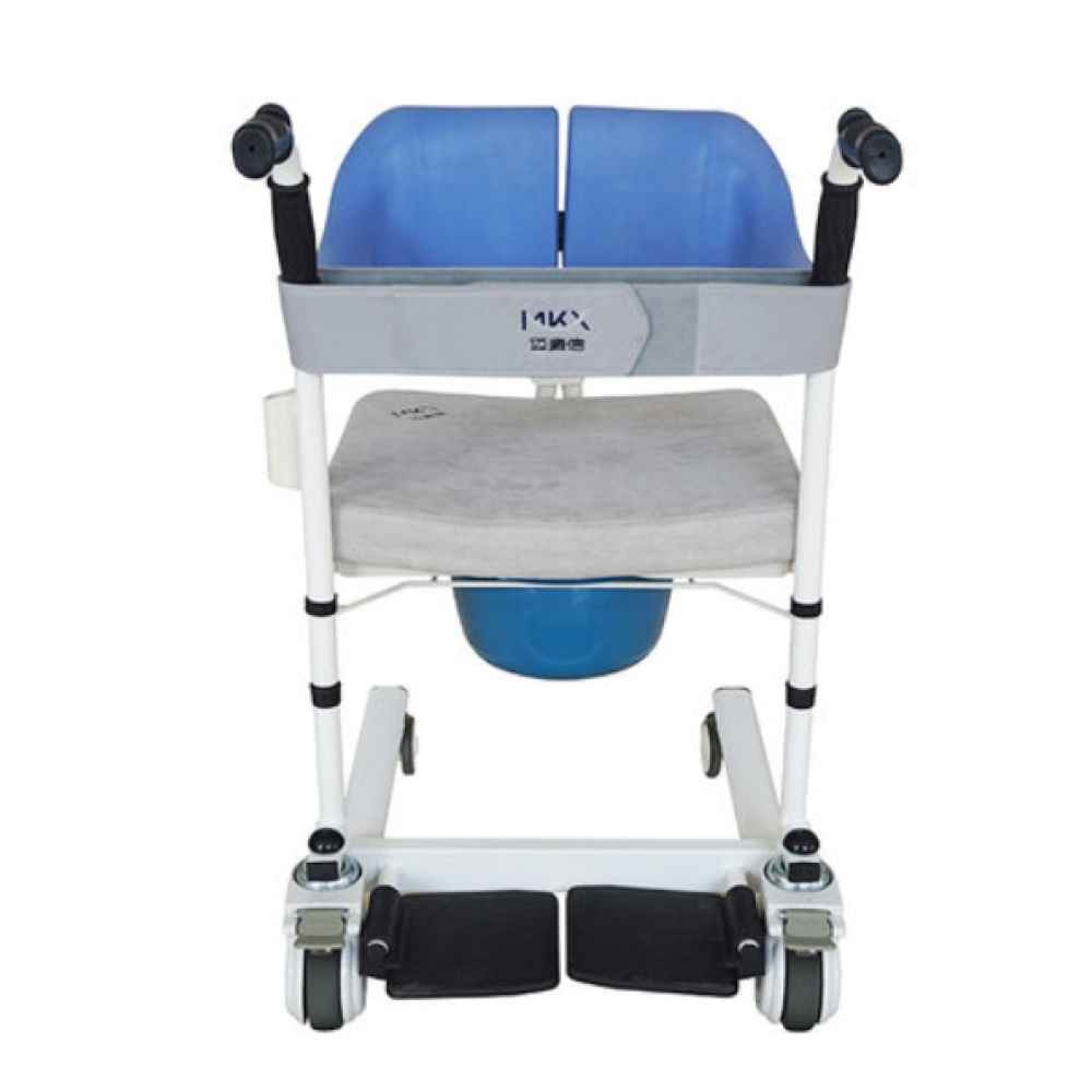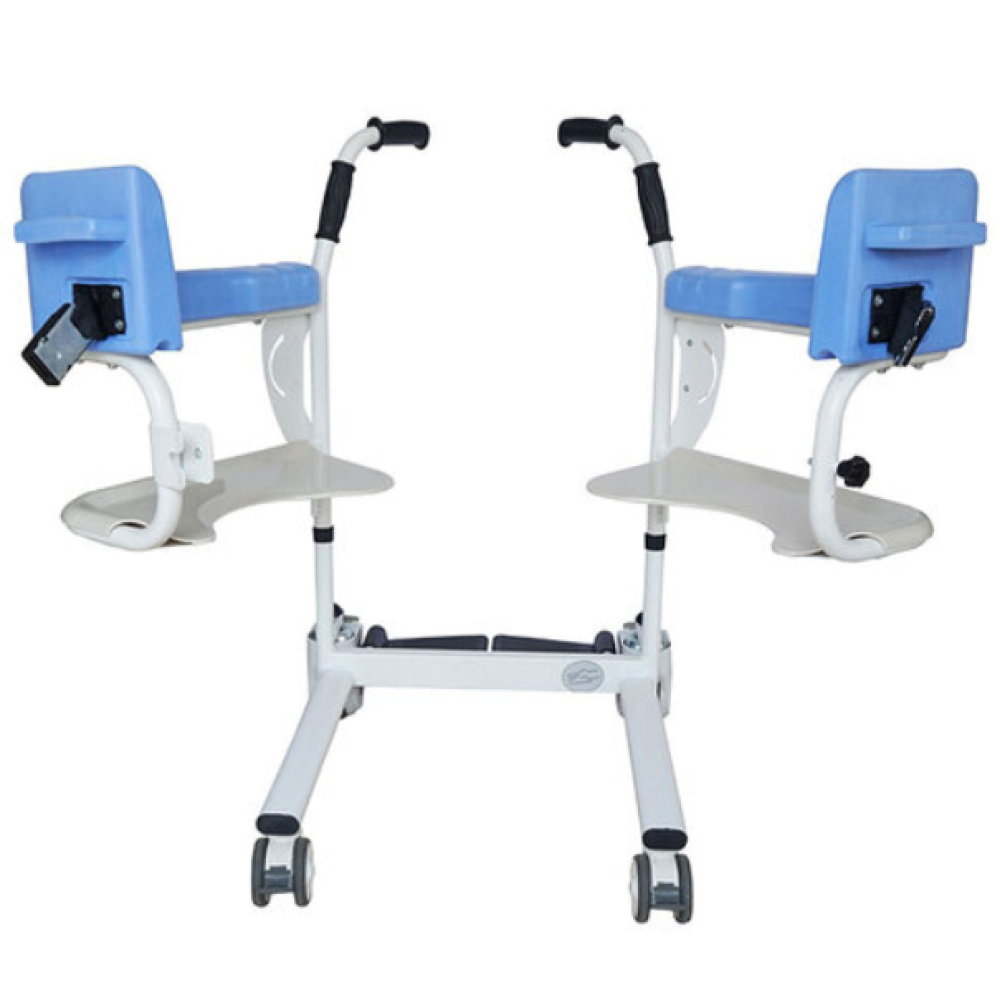 » Uma vez ajustado o assento e o encosto preso pelo cinto de fivela de dupla segurança, permite transferir o paciente com segurança. A pessoa senta-se confortavelmente graças ao encosto macio em poliuretano, ao assento ergonômico e aos apoios para os pés.