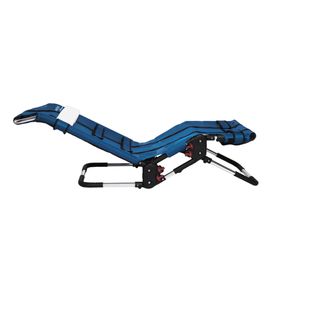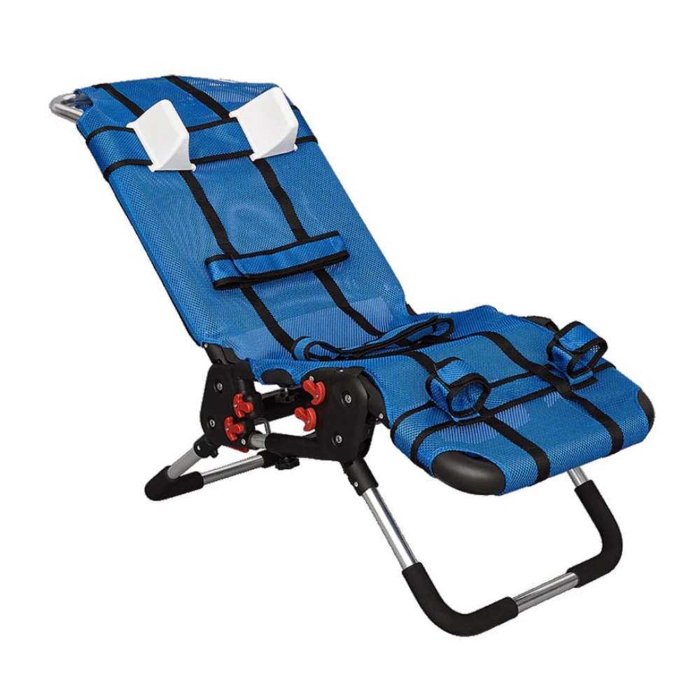 - Está equipada com 2 cintos de segurança na zona dos quadris e no peito, apoios laterais para a cabeça e tiras para as pernas;