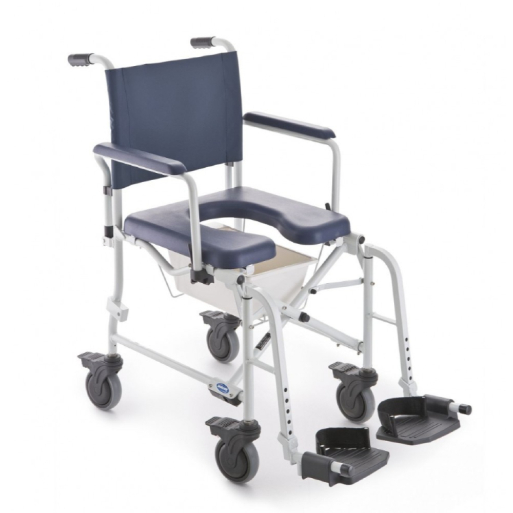» Assento almofadado recortado com tampa e apoios de braços rebatíveis para maior conforto e facilidade na higiene;