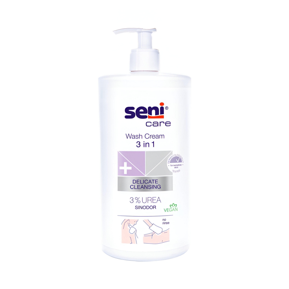 - O Seni Care creme de limpeza 3 em 1 é especialmente formulado para limpar e refrescar a pele sem a necessidade de enxágue;