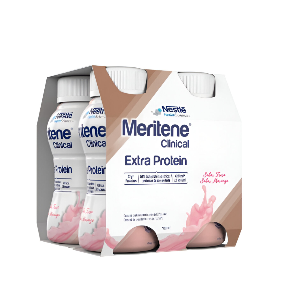 MERITENE Clinical Extra Protein é um suplemento nutricional oral completo, hipercalórico e hiperproteico, sem fibra. Indicado para doentes com necessidades energéticas e proteicas aumentadas e com patologias que levam à desnutrição ou risco de desnutrição, como por exemplo, perda de peso involuntária acentuada, patologias com alto impacto nutricional (cancro, demência, Parkinson, DPOC* e doenças neurodegenerativas) e doentes submetidos a tratamentos (cirurgia, quimioterapia e radioterapia).