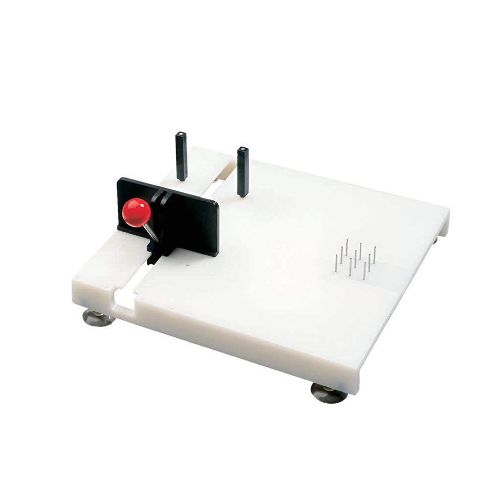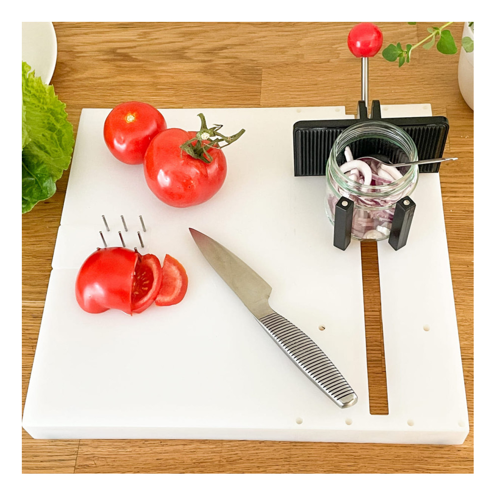 - A base da tábua tem pés anti-deslizantes com ventosas e na sua superficie tem encaixes em ácido inoxidável para fixar os alimentos a cortar;
