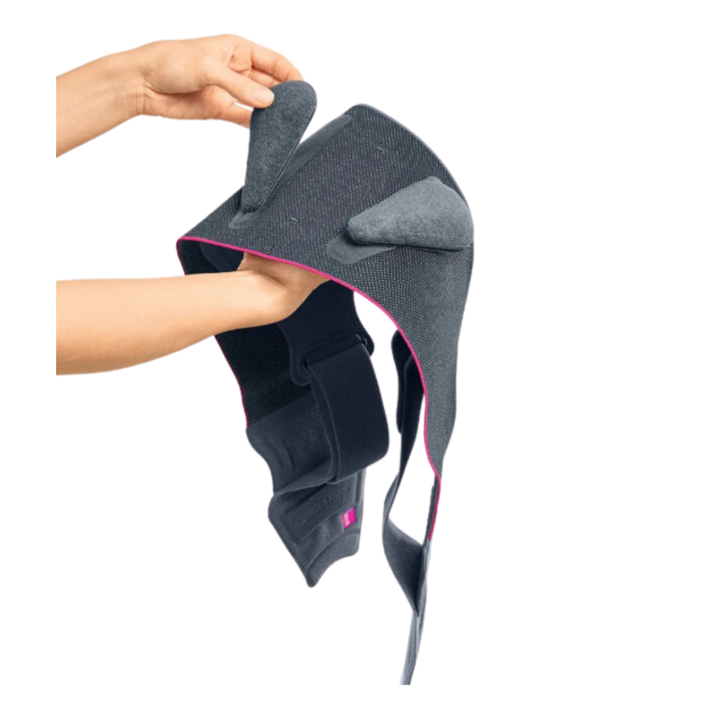 - A cinta trás duas almofadas que se podem posicionar de forma flexível para um alívio da dor em pontos especificos, ajudando a acelarar o processo de cicatrização;